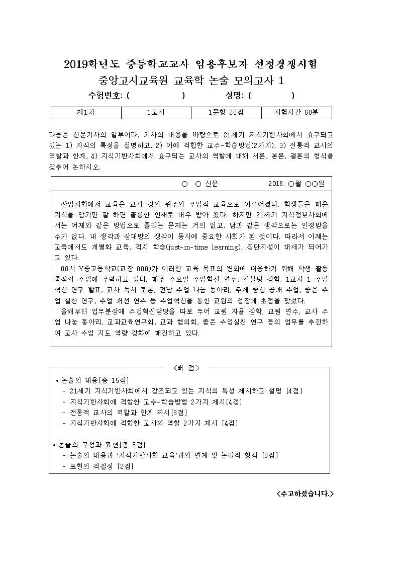 게시되어 있는 논제에 대한 논술을 첨부파일에 있는 답안지를 다운받아 형식에 맞춰 작성 후, 파일이름에서 홍길동을 본인이름으로 수정하셔서 저장하여 9월 16일 일요일까지 joonganggosi@nate.com 으로 이메일 발송해주시기 바랍니다.